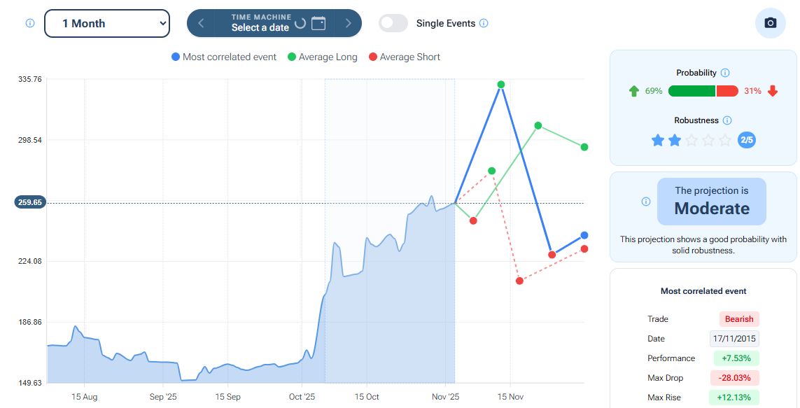 Il tool “Projection” della piattaforma Forecaster, con scadenza a un mese, evidenzia – nello scenario “best match” – un rialzo di circa il 28% in area 332 dollari, seguito da un possibile storno verso area 228 dollari. Il scenario “long” invece stima dapprima uno storno verso area 249 dollari e successivamente una ripartenza al rialzo verso area 307 dollari. Guarda il video di lancio della funzionalità, PREVEDERE I MERCATI CON L’INTELLIGENZA ARTIFICIALE: la nuova funzionalità di Forecaster Terminal.