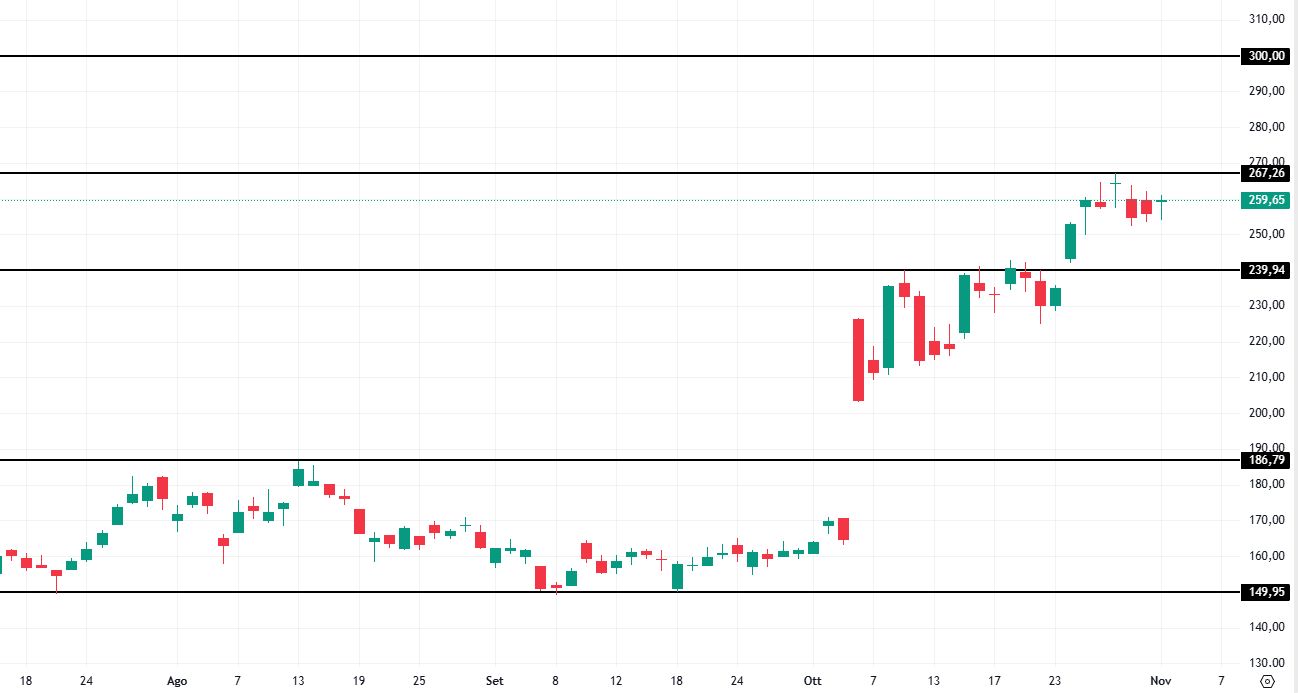 Si potrebbero quindi valutare strategie long in caso di breakout dei 267 dollari o sulla debolezza da area 240 dollari. Il primo obiettivo di profitto potrebbe essere posto in area 280 dollari e il successivo in area 300-310 dollari.