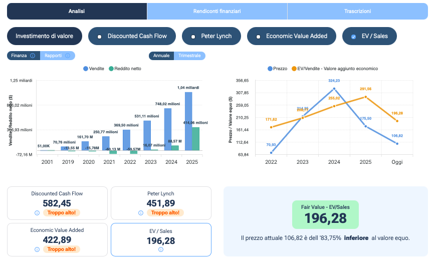 Il nostro software è programmato per escludere automaticamente un metodo di calcolo qualora restituisca valori troppo alti o troppo bassi, per evitare che anomalie temporanee falsino l'output finale. Ebbene, nel caso di Duolingo, Forecaster arriva a disattivarne in automatico ben tre su quattro. Questo non accade per via di anomalie nei bilanci, ma perché la quotazione è scesa a tal punto da risultare talmente a sconto che l'algoritmo stesso la interpreta come un potenziale errore di sistema.