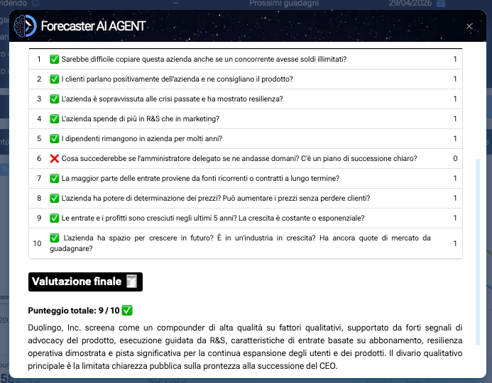 Ci troviamo di fronte a un'azienda con un fatturato in crescita vertiginosa, un cash flow ampiamente positivo e riserve di cassa solide. È una società in estrema salute. Non a caso, l'analisi qualitativa elaborata dal Forecaster AI Agentassegna a Duolingo un punteggio stellare di 9 su 10. Stiamo parlando di una realtà aziendale oggettivamente eccezionale e che mette quasi soggezione per la sua solidità.