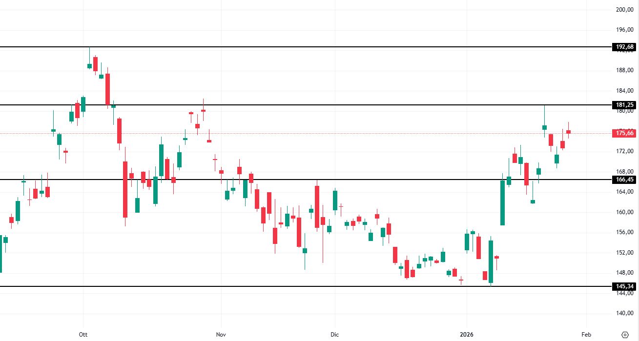 Da inizio anno, le azioni Alibaba (ADR al NYSE) hanno ripreso forza dall’area di supporto a 145 dollari, tornano su livelli che non si vedevano da ottobre scorso. L’attuale struttura grafica di breve termine favorirebbe l’implementazione di strategie long in linea con il trend sottostante.