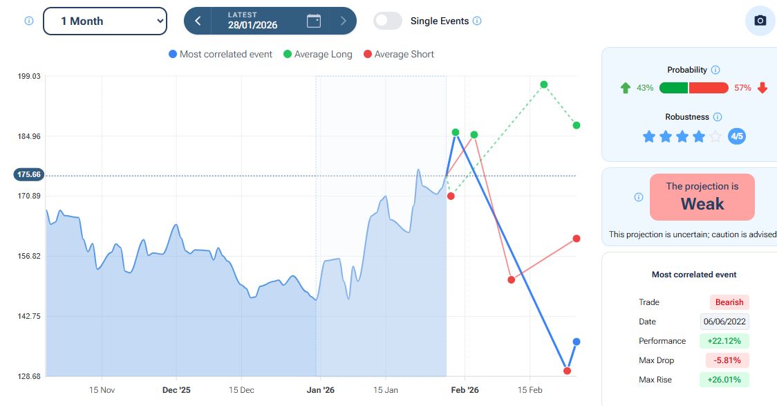 Per quanto riguarda la stagionalità - analizzata con la piattaforma Forecaster - gli archi temporali selezionati mostrano un possibile minimo nei primi giorni di febbraio e un successivo rimbalzo fino a metà mese, prima di un eventuale storno che potrebbe estendersi fino a metà marzo.