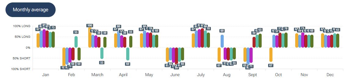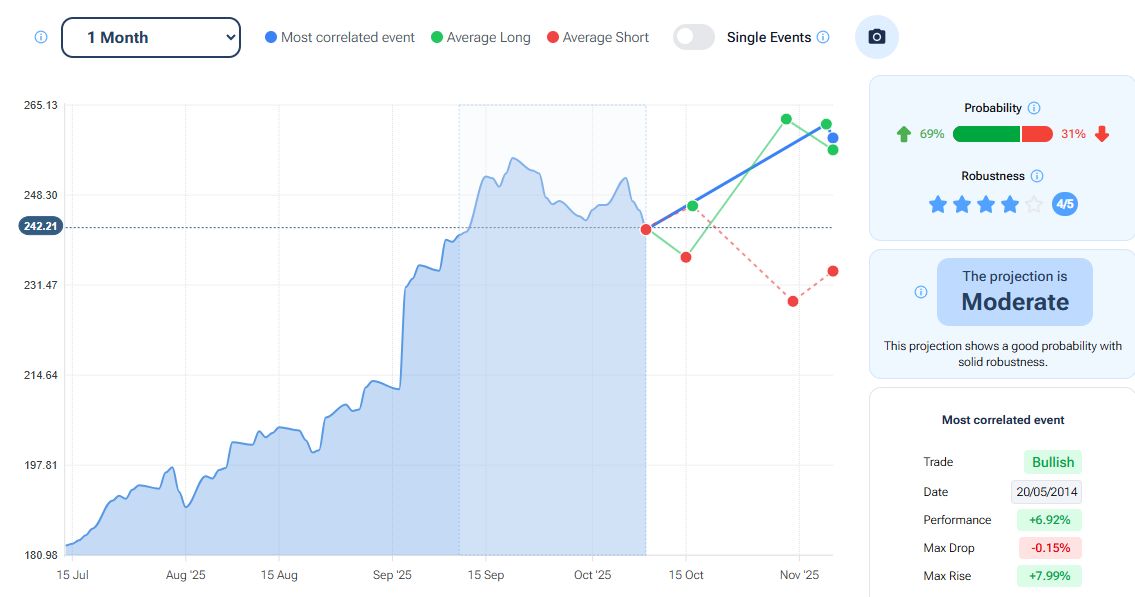 Per quanto riguarda la stagionalità - analizzata con la piattaforma Forecaster - gli archi temporali selezionati mostrano una possibile fase positiva fino alla fine della prima decade di ottobre, seguita da una possibile fase di lateralità fino a inizio gennaio 2026.