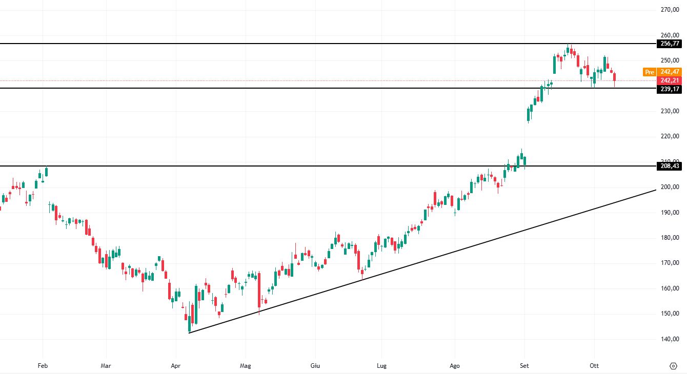 Si potrebbero valutare strategie long in caso di segnali di forza in area 239-240 dollari. In tal caso, posizioni in acquisto avrebbero come primo target di breve termine area 256 dollari e un successivo obiettivo a 270 dollari. La violazione dei 239 dollari darebbe invece ampio spazio di manovra ai venditori, idealmente fino al sostegno orizzontale a 208 dollari.