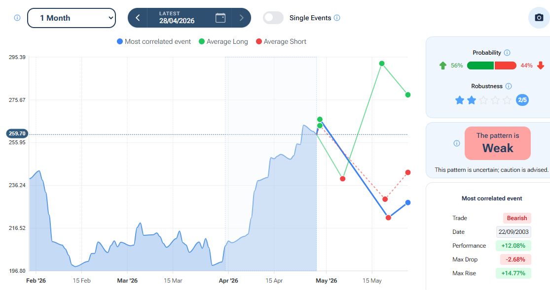 Il tool “Pattern” della piattaforma Forecaster, con orizzonte temporale a 1 mese, evidenzia nello scenario long (linea verde) un iniziale storno verso area 239 dollari, seguito da un possibile rialzo verso zona 292 dollari. Lo scenario “best match” (linea blu) stima invece un possibile storno verso area 221 dollari, prima di un eventuale rimbalzo (guarda come funziona il tool “Pattern” di Forecaster Terminal).