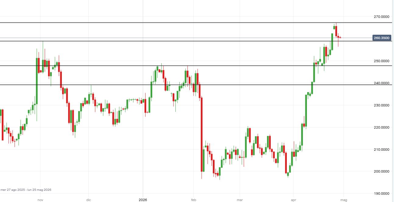 In attesa della trimestrale, le azioni Amazon sono impostate in forte rialzo nel breve termine, in particolare dai minimi registrati in area 200 dollari a fine marzo. Eventuali segnali di forza in prossimità del supporto a 259 dollari potrebbero essere sfruttati per valutare posizioni in acquisto, in linea con il trend di fondo.