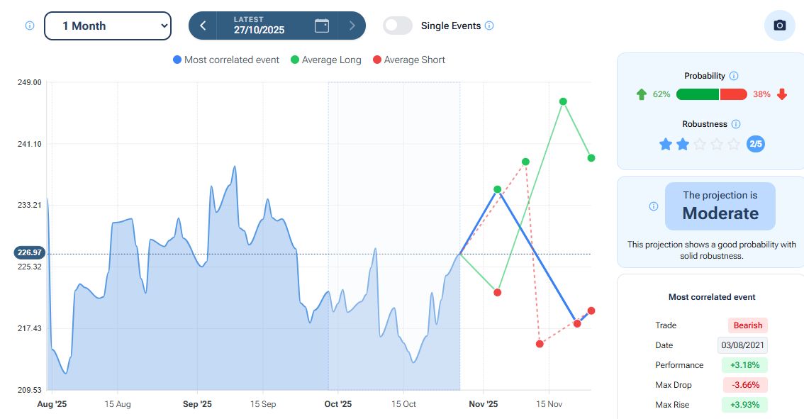 Il tool “Projection” della piattaforma Forecaster, con scadenza a un mese, evidenzia indicazioni contrastanti. Nello scenario “best match” (linea blu), il modello stima un iniziale rialzo di circa il 3,6% seguito da un ribasso di quasi il 4%, in area 218 dollari.