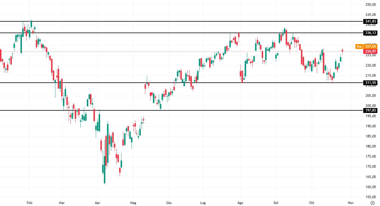 Si potrebbero quindi valutare strategie long in caso di segnali di forza presso i livelli a 220 e 211 dollari. In tal caso, posizioni in acquisto avrebbero come primo obiettivo la resistenza compresa tra i 236 e 242 dollari. Un secondo target potrebbe essere posto in area 250 dollari.