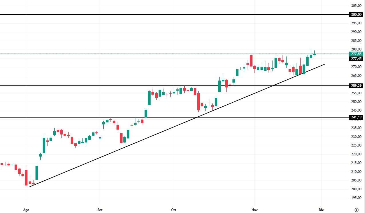 Si potrebbero valutare strategie long in caso di segnali di forza in area 277-280 dollari. In tal caso, eventuali posizioni in acquisto avrebbero come primo obiettivo area 290 dollari e un target più ambizioso in area 300 dollari.