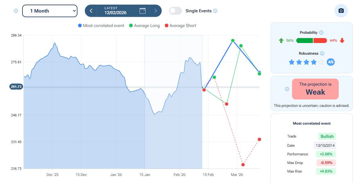 Il tool “Projection” della piattaforma Forecaster, con orizzonte temporale a un mese, evidenzia – nello scenario “best match” (linea blu) e “long” (linea verde) – un possibile rialzo verso area 284-287 dollari, prima di un eventuale storno (PREVEDERE I MERCATI CON L’INTELLIGENZA ARTIFICIALE: la nuova funzionalità di Forecaster Terminal).
