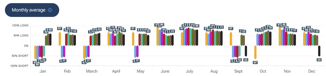 Per quanto riguarda la stagionalità - analizzata con la piattaforma Forecaster - gli archi temporali selezionati mostrano una possibile fase di debolezza che potrebbe estendersi fino a fine mese, seguita da una potenziale fase rialzista che potrebbe durare fino a metà maggio.