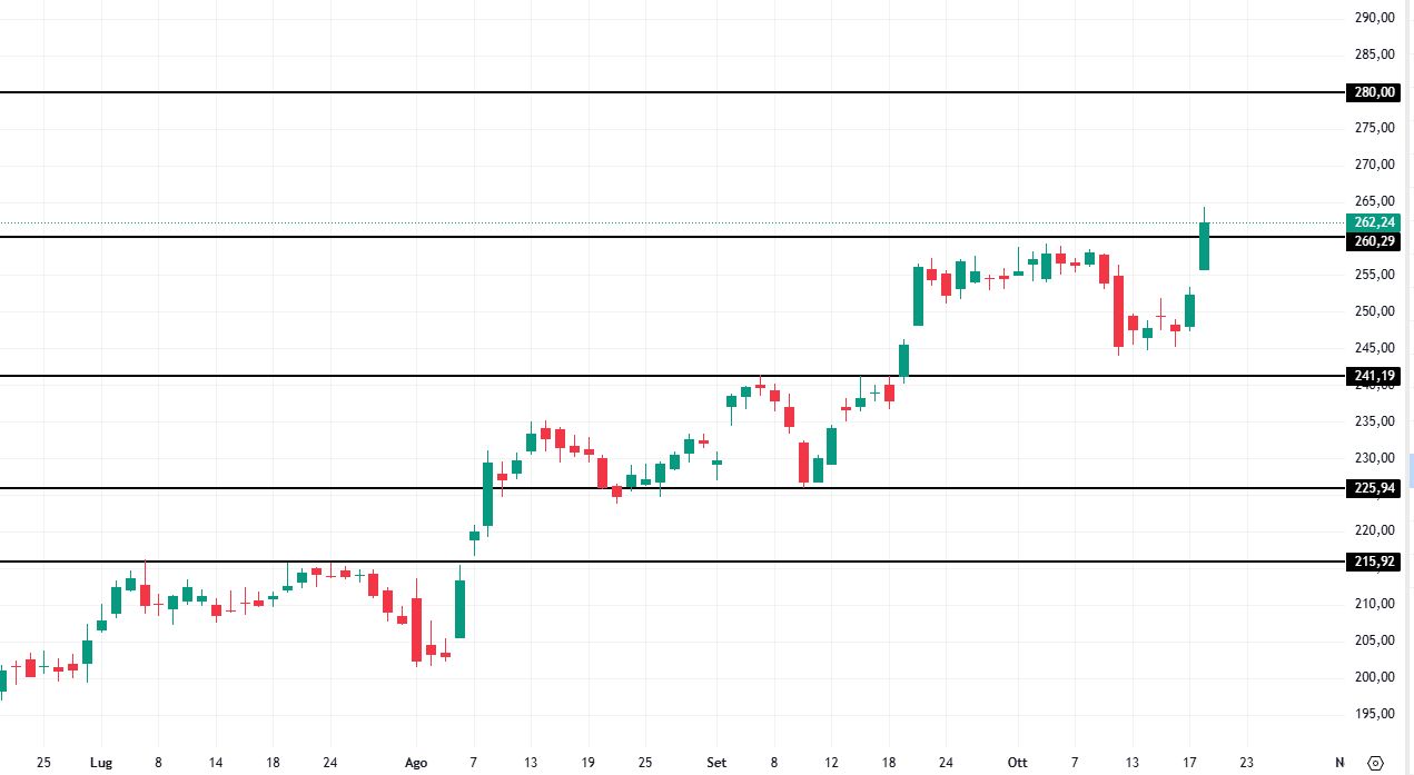 Si potrebbero dunque valutare strategie long in caso di segnali di forza in area 260 dollari o, in caso di ritracciamento, in area 251-250 dollari. I livelli da guardare per possibili target di breve termine sono posti a 260, 270 e 280 dollari.