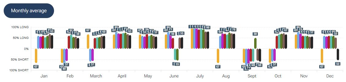 Per quanto riguarda la stagionalità - analizzata con la piattaforma Forecaster - gli archi temporali selezionati mostrano una possibile fase positiva che potrebbe estendersi fino a inizio dicembre, seguita da un possibile storno fino alla fine della seconda decade di dicembre.
