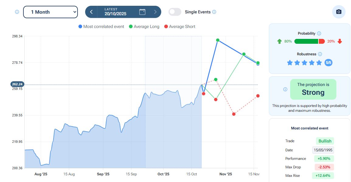 Il tool “Projection” della piattaforma Forecaster, con scadenza a un mese, stima – nello scenario “best match” (linea blu) – un rialzo di oltre il 12%, che porterebbe i prezzi in area 295 dollari. Il scenario long (linea verde) stima invece uno storno di circa il 4%, prima di un possibile rialzo verso area 285 dollari. Guarda il video di lancio della funzionalità, PREVEDERE I MERCATI CON L’INTELLIGENZA ARTIFICIALE: la nuova funzionalità di Forecaster Terminal.
