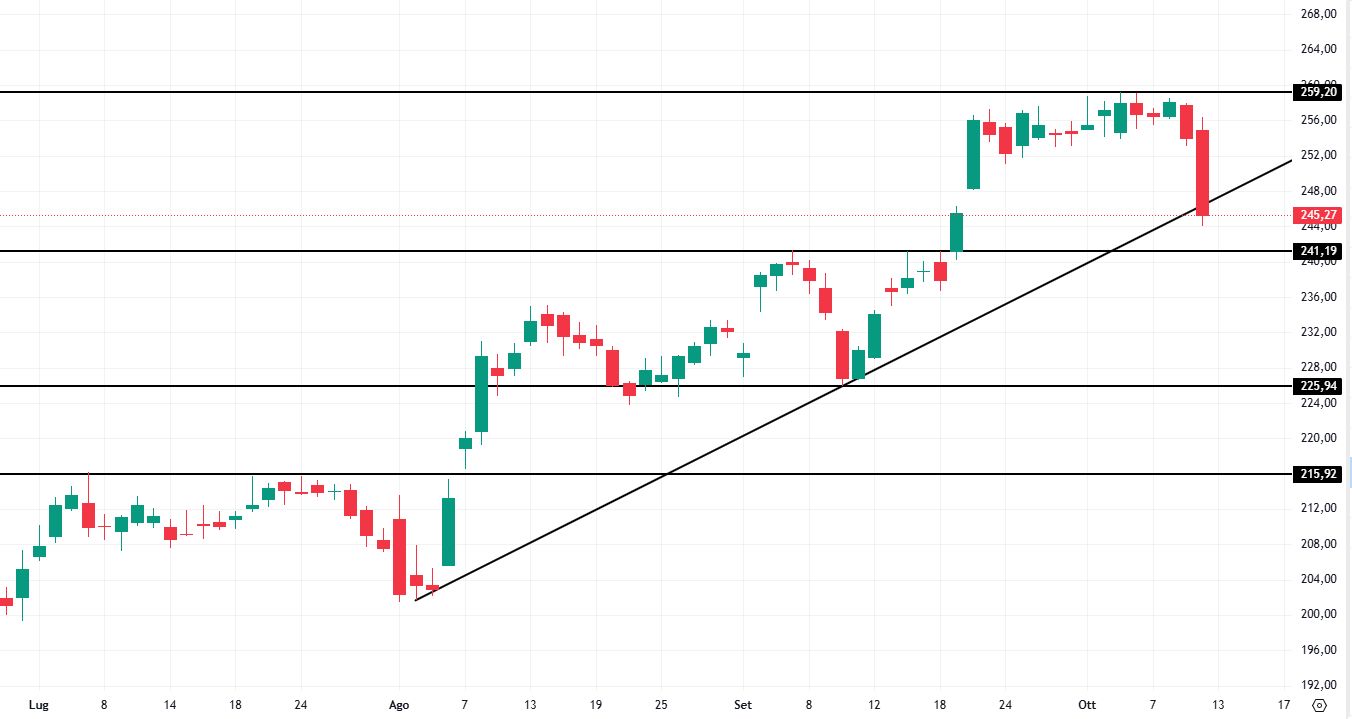 Si potrebbero valutare strategie long in caso di segnali di forza in area 241 dollari, oppure, nel caso dovesse manifestarsi un ribasso più profondo, presso il sostegno in area 226 dollari. Nel primo caso, un obiettivo di profitto potrebbe essere posto sui massimi in area 260 dollari. Posizioni in acquisto invece da area 226 dollari avrebbero come primo target area 241 dollari e successivo obiettivo in zona 260 dollari.