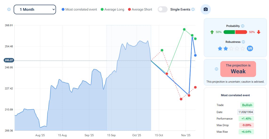 Il tool “Projection” della piattaforma Forecaster, con scadenza a un mese, evidenzia indicazioni contrastanti. Il “best match” scenario (linea blu solida) stima uno storno di circa il 9% in area 223 dollari, prima di un deciso rimbalzo, mentre il scenario long indica un iniziale storno più contenuto (-3,5%), seguito da un rialzo nell’ordine dell’8%. Guarda il video di lancio della funzionalità: PREVEDERE I MERCATI CON L’INTELLIGENZA ARTIFICIALE: la nuova funzionalità di Forecaster Terminal.