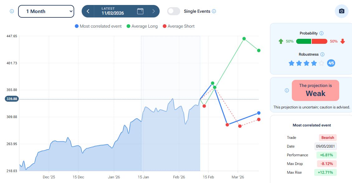 Il tool “Projection” della piattaforma Forecaster, con orizzonte temporale a un mese, evidenzia – nello scenario “best match” (linea blu) e “short” (linea rossa) andamenti contrastanti. Nello scenario “best match” il modello stima un iniziale rialzo verso area 367 dollari, seguito da uno storno verso zona 297 dollari, mentre lo scenario “long” stima un rialzo fino ad area 443 dollari, prima di un eventuale storno (PREVEDERE I MERCATI CON L’INTELLIGENZA ARTIFICIALE: la nuova funzionalità di Forecaster Terminal).