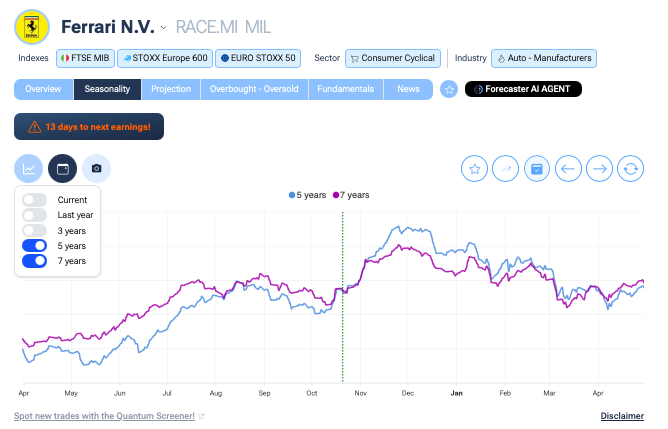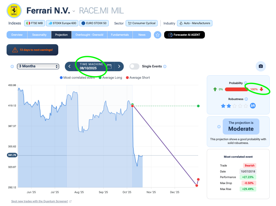 A questo si è aggiunta l'analisi della stagionalità. Proprio in corrispondenza del Capital Market Day, la stagionalità storica indicava un potenziale cambio di trend, da ribassista a rialzista. Quando la correlazione tra l'andamento del prezzo e la sua stagionalità storica è molto bassa, come lo era per Ferrari in quei giorni, spesso un cambio di direzione è imminente e violento. La combinazione di questi due elementi forniti dal Forecaster ha reso la vendita una scelta basata sulle probabilità, non sull'emotività.