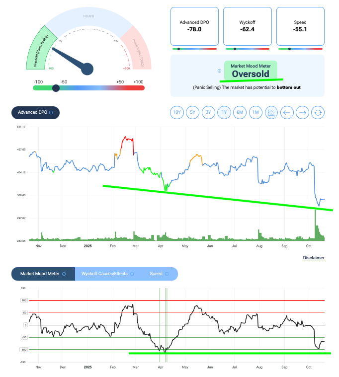 Analisi Tecnica: Il "tachimetro" della sezione Overbought/Oversold è inequivocabile: siamo in pieno Panic Selling. Storicamente, queste sono le zone in cui si fanno gli acquisti migliori. Inoltre, l'indicatore Advanced DPO, che sui massimi storici era diventato rosso segnalando pericolo, è ora tornato saldamente in zona di acquisto.