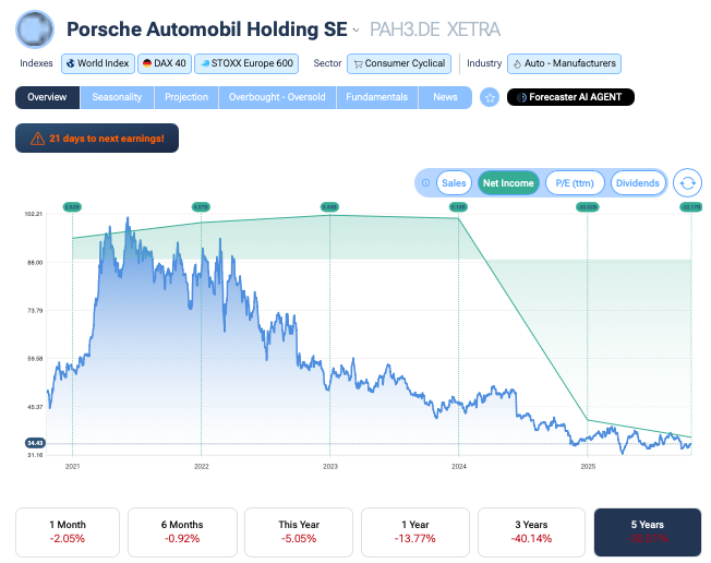 Per capire la posta in gioco, basta guardare cosa è successo a un concorrente come Porsche, un'analisi facilmente confrontabile usando la sezione Ranking del Forecaster. Negli scorsi anni, Porsche ha fatto esattamente quello che gli investitori più avidi avrebbero voluto da Ferrari: ha spinto sull'acceleratore della produzione, arrivando a fatturati stratosferici da 40 miliardi di euro.