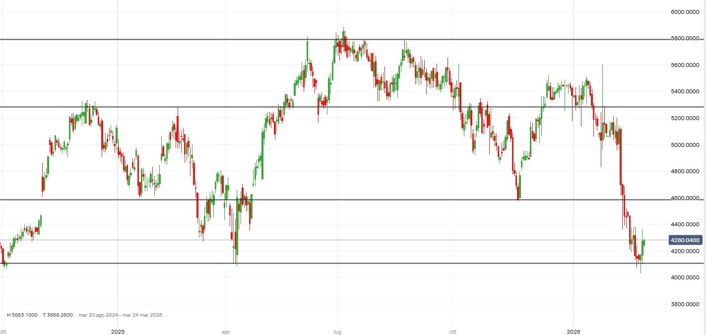 Il tool “Projection” della piattaforma Forecaster, con orizzonte temporale a un mese, evidenzia – nello scenario “best match” (linea blu) e “long” (linea verde) un iniziale storno in zona 4.120-4.020 dollari, seguito da un rialzo che potrebbe portare i prezzi in area 4.980-4.870 dollari (PREVEDERE I MERCATI CON L’INTELLIGENZA ARTIFICIALE: la nuova funzionalità di Forecaster Terminal).