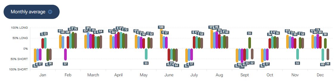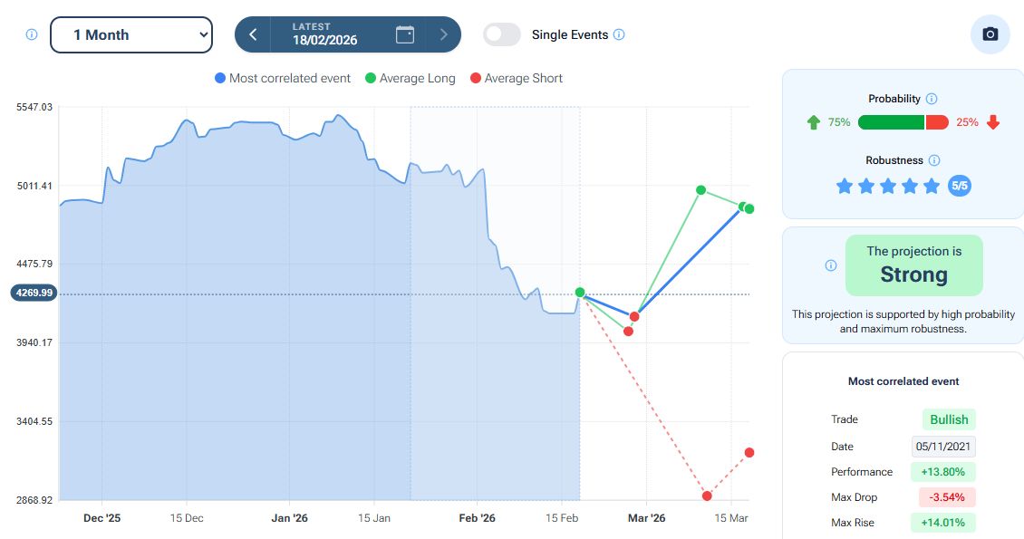 Per quanto riguarda la stagionalità - analizzata con la piattaforma Forecaster - gli archi temporali selezionati mostrano una possibile fase di debolezza che potrebbe estendersi fino alla fine della seconda decade di marzo, seguita da una potenziale ripartenza al rialzo che potrebbe durare fino alla fine della prima decade di giugno, prima di un eventuale nuovo storno.