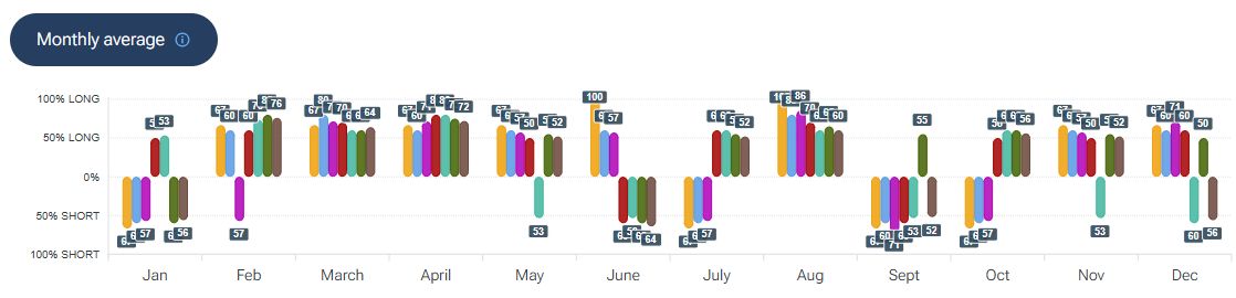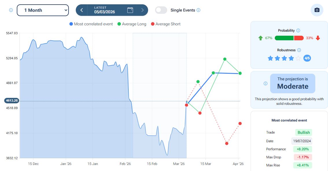 Per quanto riguarda la stagionalità - analizzata con la piattaforma Forecaster - gli archi temporali selezionati mostrano una possibile fase ribassista che potrebbe estendersi fino alla fine della seconda decade di marzo, seguita da una possibile ripartenza al rialzo che potrebbe durare fino a inizio maggio, prima di un eventuale storno.