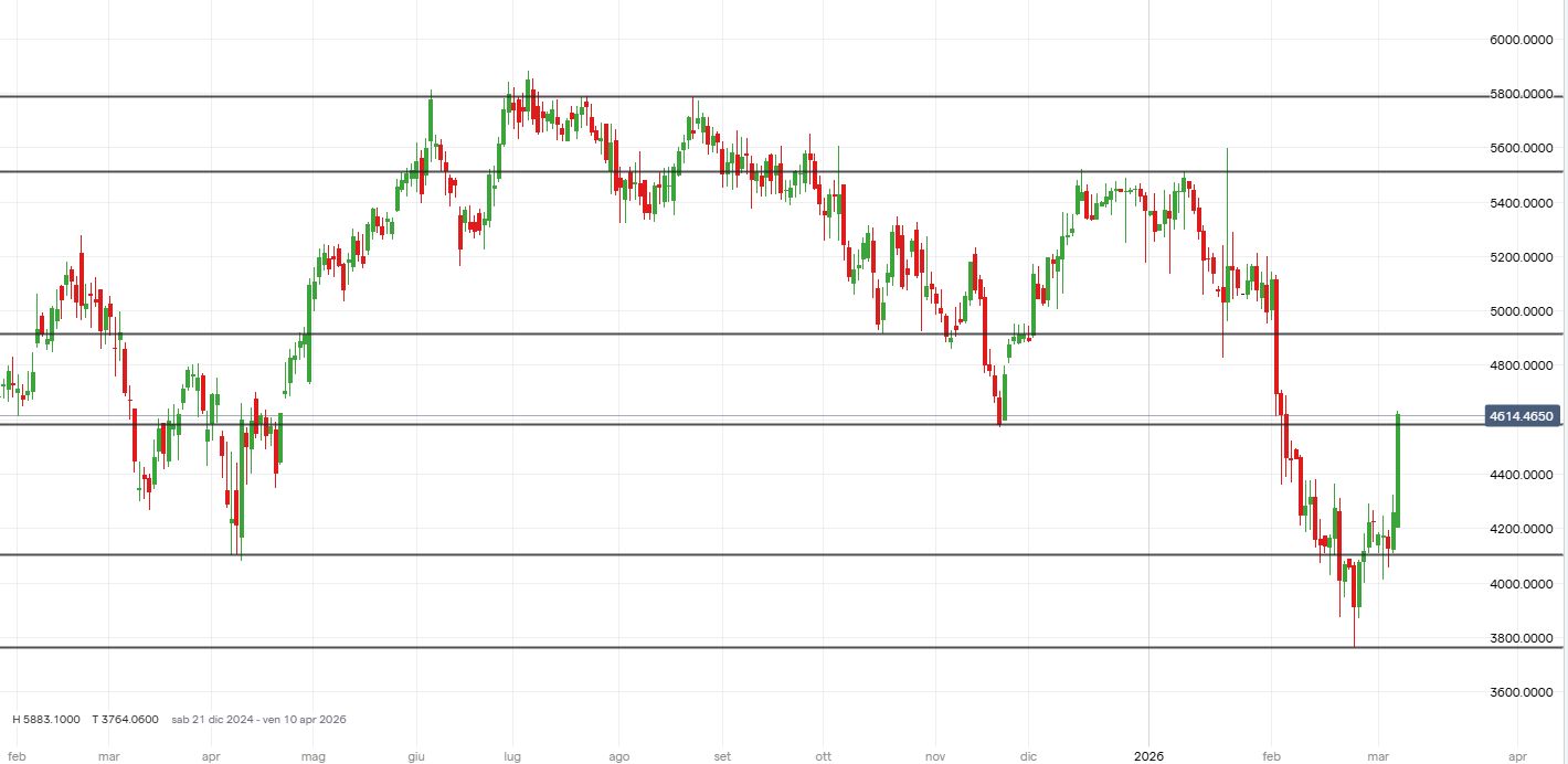 Il tool “Projection” della piattaforma Forecaster, con orizzonte temporale a 1 mese, evidenzia – nello scenario “best match” (linea blu) e “long” (linea verde) – rialzi che potrebbero portare i prezzi in area 5.000-5.190 dollari (PREVEDERE I MERCATI CON L’INTELLIGENZA ARTIFICIALE: la nuova funzionalità di Forecaster Terminal).