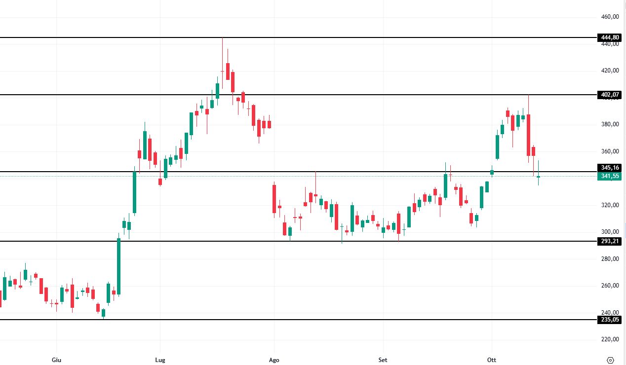 Si potrebbero dunque valutare strategie long in caso di segnali di forza in area 345 dollari o, nel caso di un proseguimento del recente storno, presso il sostegno in area 293 dollari. Nel primo caso, il primo obiettivo potrebbe essere posto in area 402 dollari, mentre un target più ambizioso in area 445 dollari. Nel secondo caso, posizioni in acquisto intraprese da area 293 dollari avrebbero come primo target area 345 dollari e un secondo obiettivo in area 402 dollari.