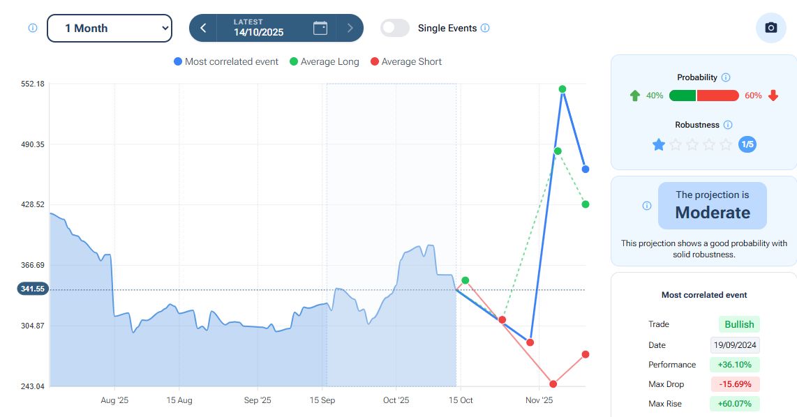 Il tool “Projection” della piattaforma Forecaster, con scadenza a un mese, stima – nello scenario “best match” – uno storno di circa il 15% in area 288 dollari, seguito da un netto rialzo fino ad area 546 dollari. Guarda il video di lancio della funzionalità, PREVEDERE I MERCATI CON L’INTELLIGENZA ARTIFICIALE: la nuova funzionalità di Forecaster Terminal.