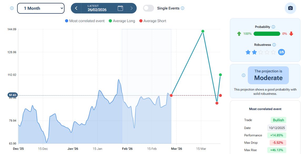 Il tool “Projection” della piattaforma Forecaster, con orizzonte temporale a un mese, stima un potenziale rialzo fino ad area 142 dollari, valori che non si vedono da ottobre 2025, seguito da un possibile storno verso area 112 dollari (PREVEDERE I MERCATI CON L’INTELLIGENZA ARTIFICIALE: la nuova funzionalità di Forecaster Terminal).