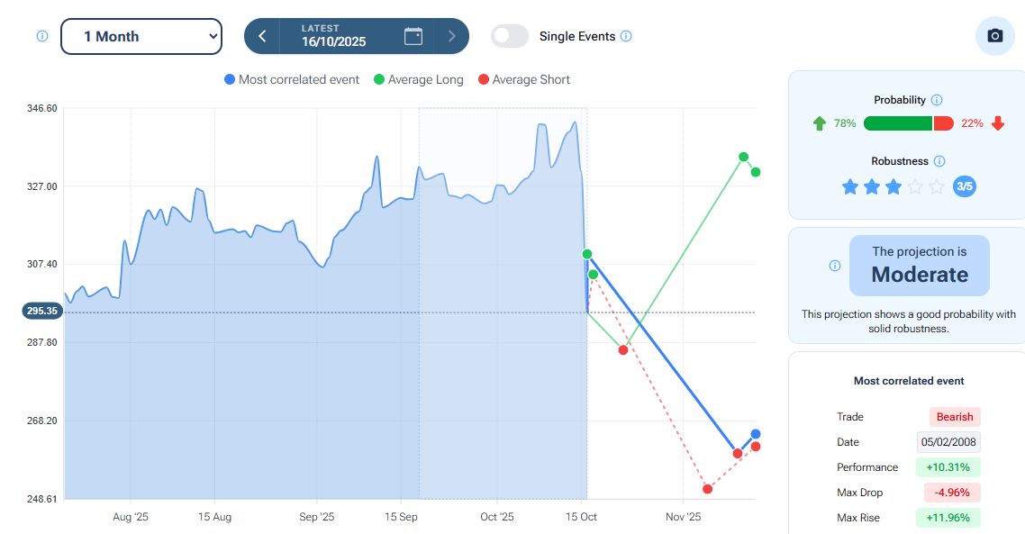 Il tool “Projection” della piattaforma Forecaster, con scadenza a un mese, stima – nello scenario “best match” - uno storno di circa il 12%, che porterebbe i prezzi in area 260 dollari, prima di un eventuale rimbalzo. Guarda il video di lancio della funzionalità, PREVEDERE I MERCATI CON L’INTELLIGENZA ARTIFICIALE: la nuova funzionalità di Forecaster Terminal.