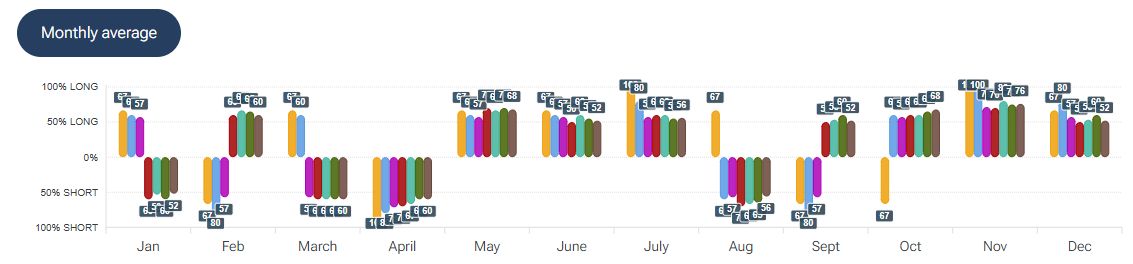Per quanto riguarda la stagionalità - analizzata con la piattaforma Forecaster - gli archi temporali selezionati mostrano una possibile fase positiva che potrebbe estendersi fino a metà dicembre, seguita da una possibile fase negativa fino a metà marzo.