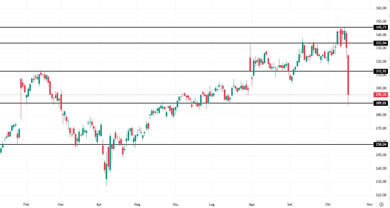 Con il crollo registrato ieri, le azioni F5 hanno interrotto il trend rialzista in atto dai minimi segnati ad aprile scorso in area 227 dollari. Eventuali segnali di forza presso il supporto orizzontale a 289 dollari potrebbero essere sfruttati per l’implementazione di strategie long di breve, con l’obiettivo di cavalcare un eventuale riassorbimento della recente flessione.