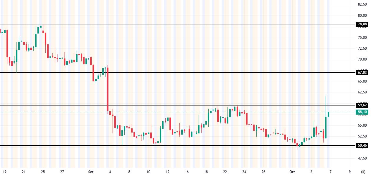 Nel caso dovesse verificarsi lo storno in area 50-51 dollari, base del trading range menzionato precedentemente, posizioni in acquisto avrebbero come primo target area 60 dollari e successivo obiettivo a 67 dollari.