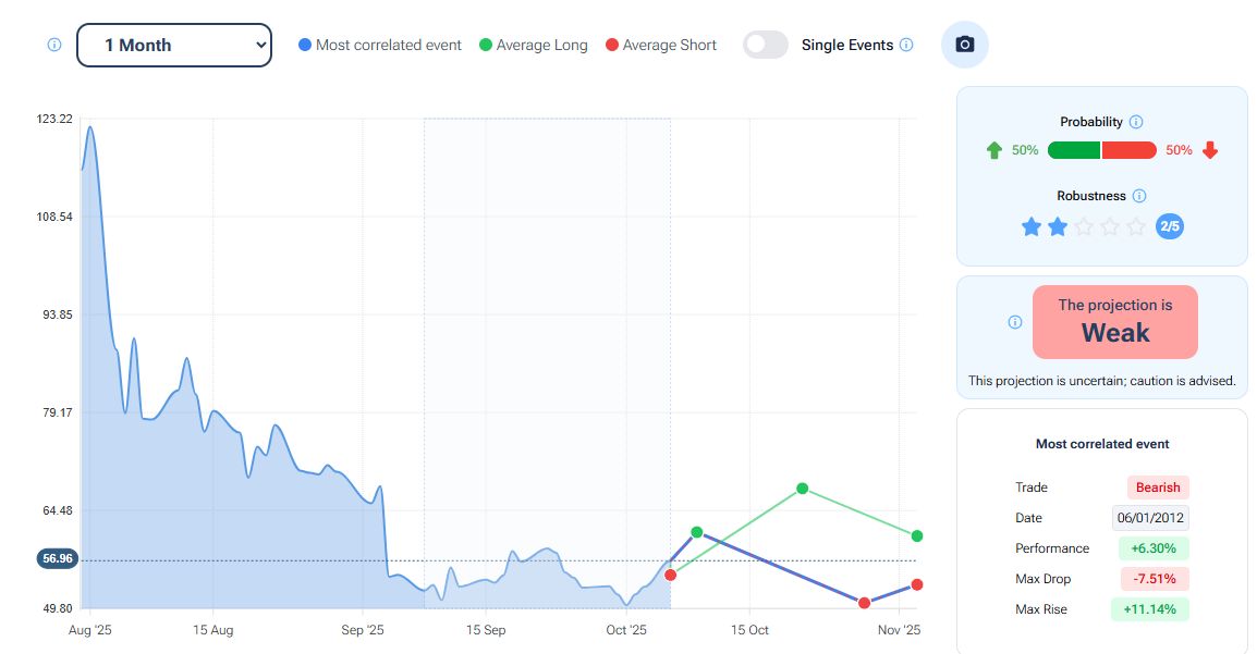 Il tool “Projection” all’interno della piattaforma Forecaster, con scadenza a un mese, evidenzia indicazioni contrastanti. Il “best match” scenario (linea blu) stima uno storno di circa l’11% in area 50-51 dollari, mentre il scenario long (linea verde) stima un progresso di circa il 19% in area 67-68 dollari. Guarda il video di lancio della nuova funzionalità: PREVEDERE I MERCATI CON L’INTELLIGENZA ARTIFICIALE: la nuova funzionalità di Forecaster Terminal.