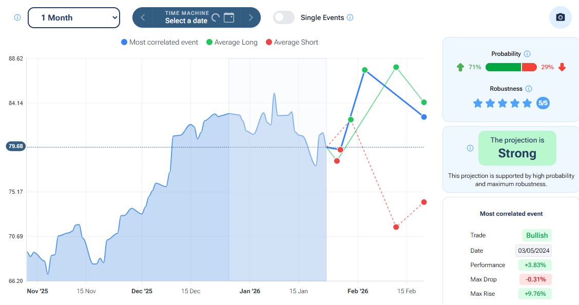 Il tool “Projection” presente nella piattaforma Forecaster, con scadenza a un mese, evidenzia – nello scenario “best match” (linea blu) e “long” (linea verde), un proseguimento del rialzo verso area 87-88 dollari, prima di un eventuale storno (PREVEDERE I MERCATI CON L’INTELLIGENZA ARTIFICIALE: la nuova funzionalità di Forecaster Terminal).