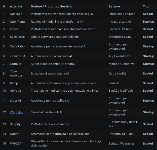 Se la tesi di Bezos è corretta, i futuri vincitori sono coloro che oggi stanno già sfruttando questa "nuova fibra ottica" computazionale. Analizzando l'elenco dei maggiori utilizzatori premiati da OpenAI e incrociando i nomi con le aziende corrispondenti su LinkedIn, emergono nomi estremamente familiari e, per noi, significativi.