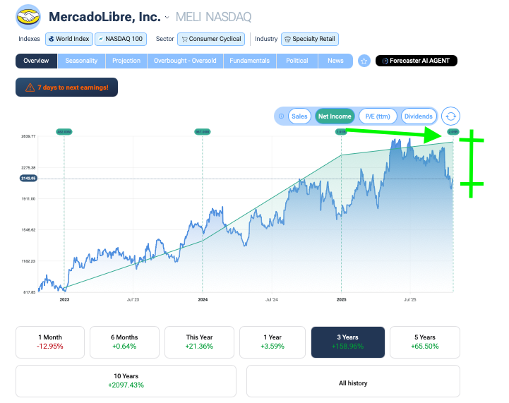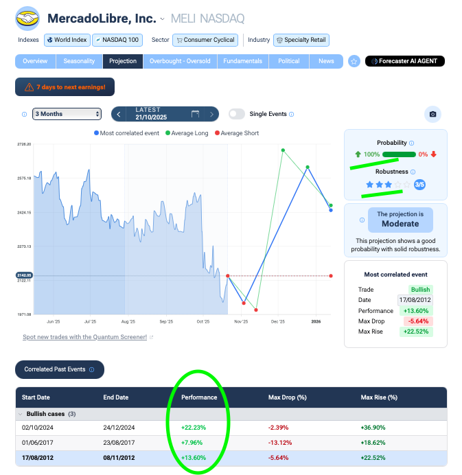 Avere individuato un'azienda solida è solo metà del lavoro. Il timing è cruciale. Analizzando il grafico di Mercado Libre ($MELI) con gli indicatori di Forecaster, emerge un'opportunità interessante proprio in questi giorni.
