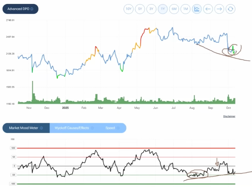 L'indicatore Advanced DPO è diventato verde dopo che il prezzo è sceso nella zona di ipervenduto, superando poi la linea dello zero. In concomitanza, si è formata una divergenza rialzista tra i prezzi (che segnavano nuovi minimi) e l'indicatore (che segnava minimi crescenti). Questo, per la nostra strategia, è un chiaro segnale d'acquisto su un ribasso tecnico.