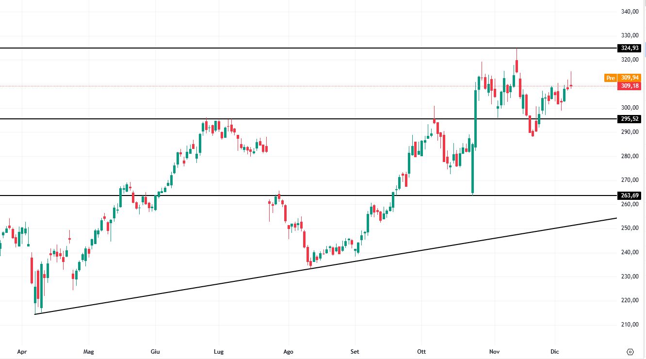 Si potrebbero dunque valutare strategie long in linea con il trend dominante in caso di segnali di forza in area 300-295 dollari. In tal caso, posizioni in acquisto avrebbero come primo obiettivo area 320-324 dollari e un secondo target in zona 348-350 dollari.