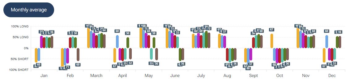Per quanto riguarda la stagionalità - analizzata con la piattaforma Forecaster - gli archi temporali selezionati mostrano un potenziale minimo intorno al 17 dicembre, seguito da una possibile ripartenza al rialzo che potrebbe estendersi fino a metà febbraio.