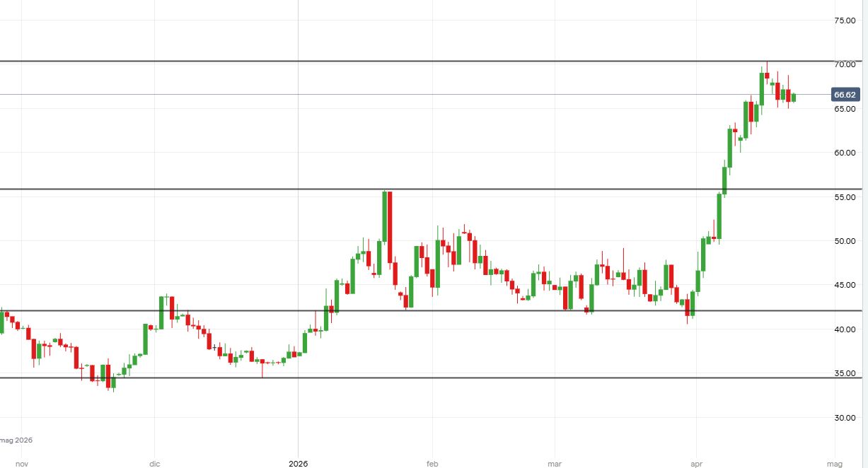 Le azioni Intel rimangono impostate al rialzo, nonostante il recente movimento correttivo che ha riportato i prezzi in area 66 dollari. La struttura orientata al rialzo da fine marzo farebbe privilegiare l’implementazione di strategie long, in linea con il trend di fondo.