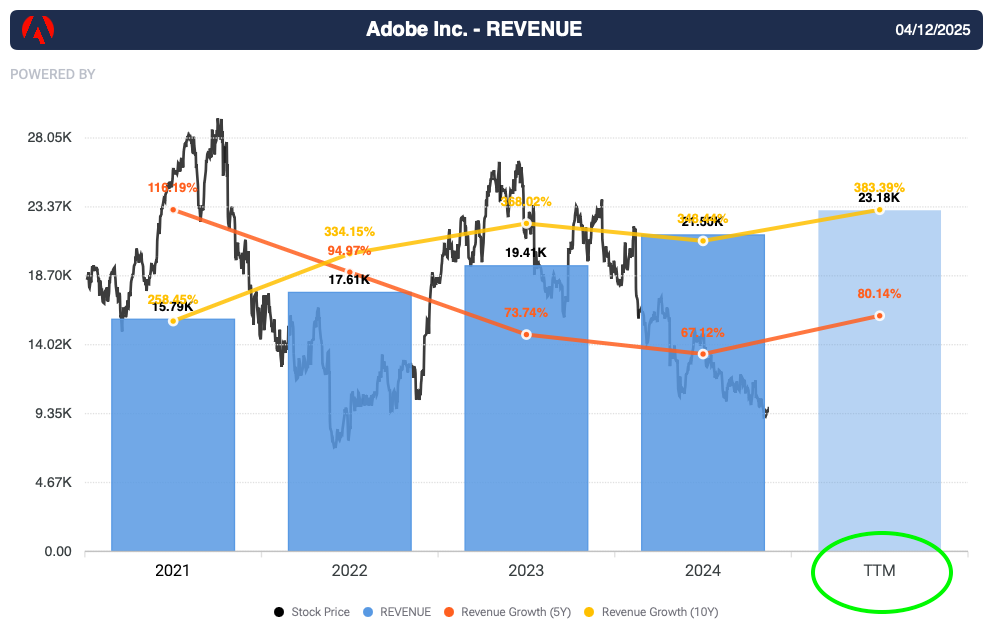 Situazione identica a quella di Google. La narrazione dice: "Sora e Canva uccideranno Adobe". Il titolo soffre. I dati dicono: