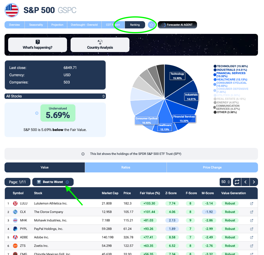 Non andiamo a caccia alla cieca. Nella sezione Rankings del Forecaster (ad esempio sull'indice S&P 500), utilizziamo la funzione Best to Worst. Questo algoritmo fa una media di tutti i parametri fondamentali vitali (Fair Value, Z-Score, F-Score, M-Score, Value Generation) e ci restituisce in cima alla lista le aziende qualitativamente migliori e potenzialmente più sottovalutate.