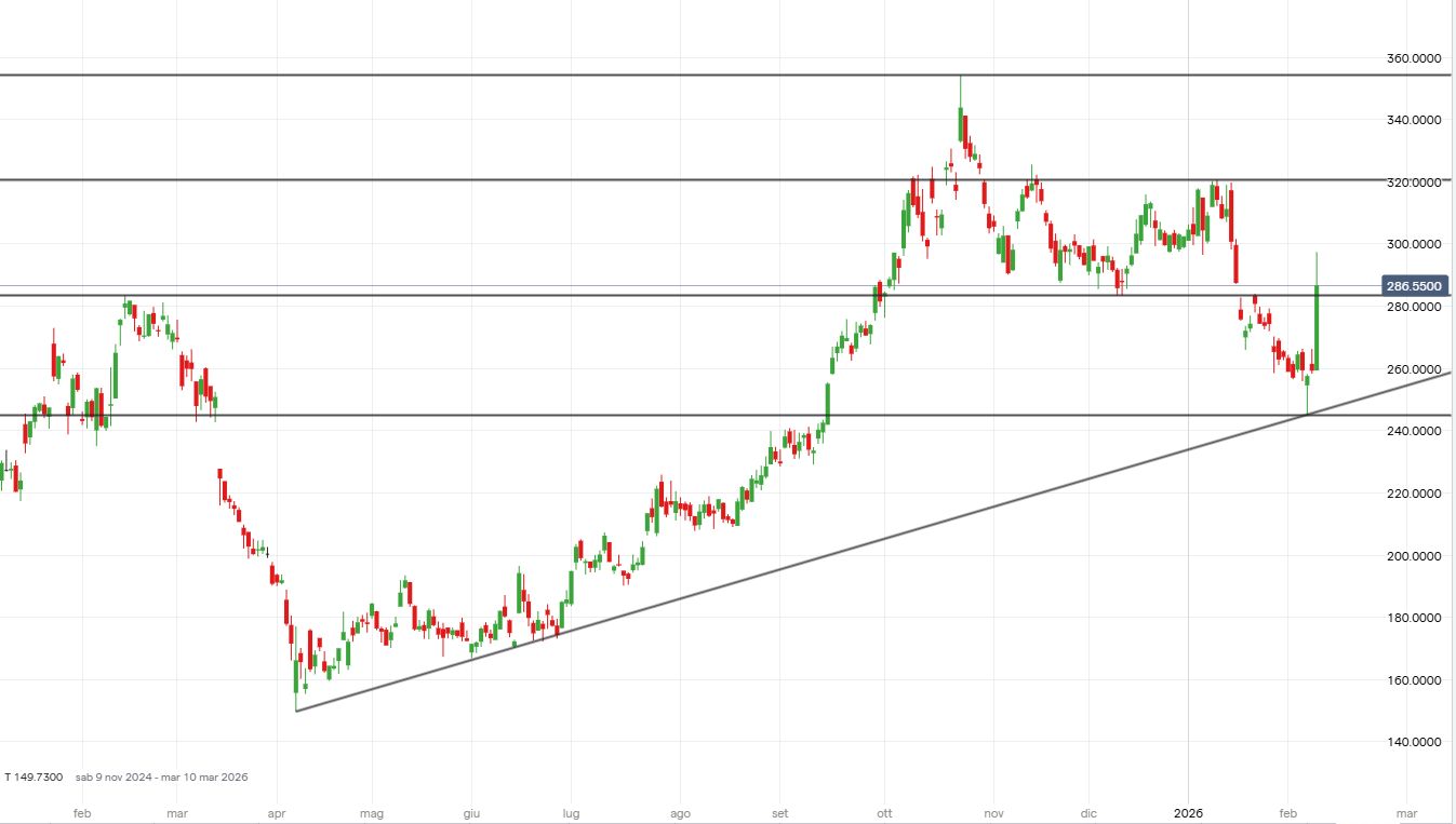 Nonostante il balzo in corso, le azioni Kering rimangono impostate al ribasso se si guarda l’azione dei prezzi in atto dai massimi segnati a ottobre in area 354 euro. I prezzi hanno rimbalzato dopo il test della linea di tendenza che collega i minimi segnati ad aprile e giugno 2025, tornando sopra al livello statico a 283 euro. La difesa di quest’ultimo livello potrebbe favorire l’implementazione di strategie long.