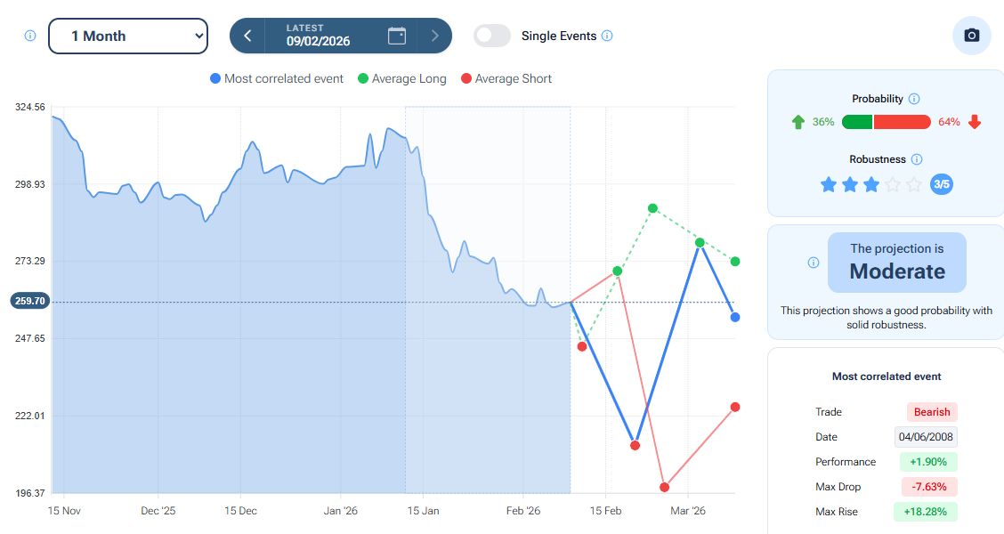 Il tool “Projection” della piattaforma Forecaster, con orizzonte temporale a un mese, evidenzia – nello scenario “best match” (linea blu) e “short” (linea rossa) una possibile flessione verso area 212-198 euro, seguita da un possibile rimbalzo verso area 280 euro (scenario “best match”). (PREVEDERE I MERCATI CON L’INTELLIGENZA ARTIFICIALE: la nuova funzionalità di Forecaster Terminal).