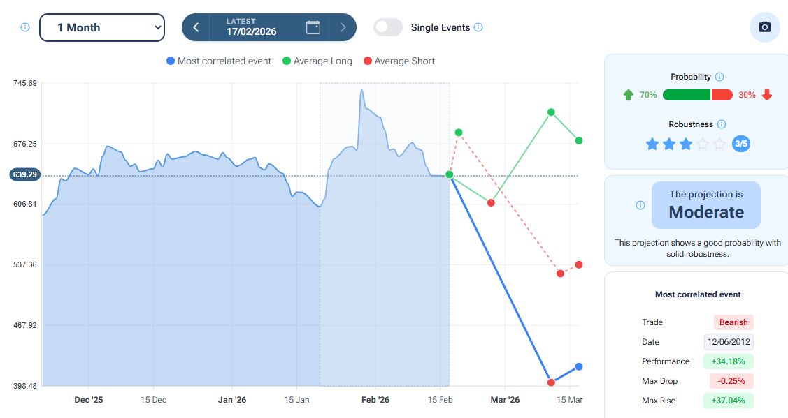 Per quanto riguarda la stagionalità - analizzata con la piattaforma Forecaster - gli archi temporali selezionati mostrano una possibile fase di debolezza che potrebbe estendersi fino alla fine della seconda decade di marzo, seguita da una potenziale ripartenza al rialzo che potrebbe durare fino alla fine della prima decade di aprile, prima di un eventuale nuovo storno.