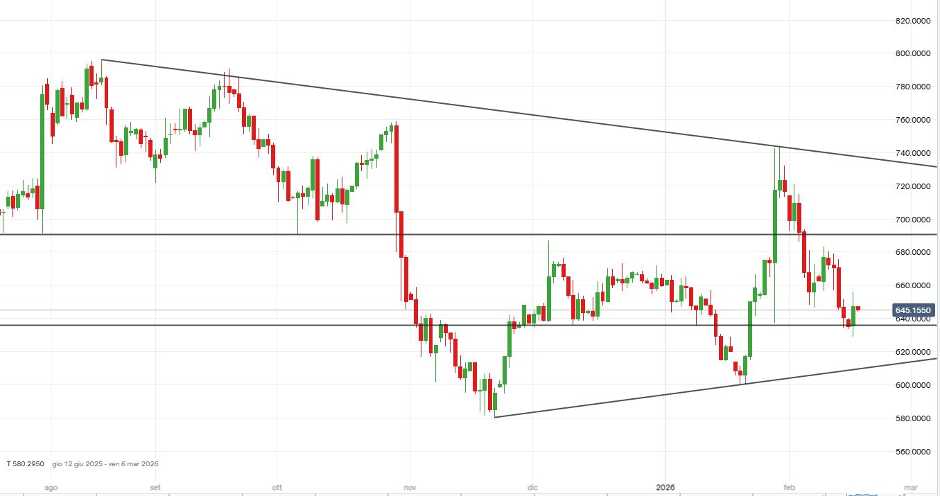 Le azioni Meta Platforms sono rimbalzate dal supporto in area 636 dollari, mentre rimangono all’interno dell’ampia struttura di compressione in atto da agosto dello scorso anno. La difesa della linea di tendenza che collega i minimi segnati a novembre e gennaio, ora transitante in area 611 dollari, potrebbe consentire l’implementazione di strategie long.