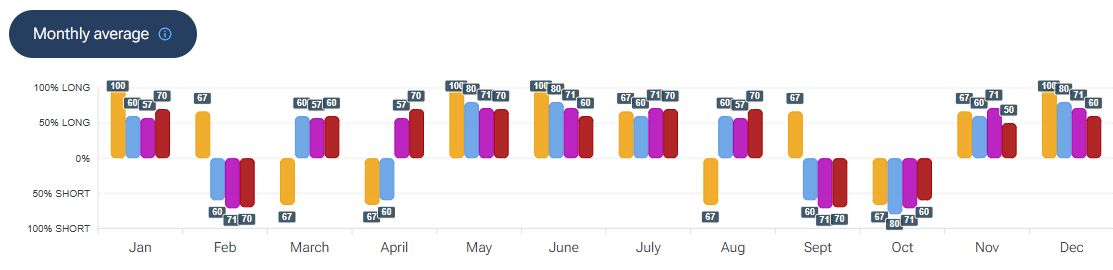 Per quanto riguarda la stagionalità - analizzata con la piattaforma Forecaster - gli archi temporali selezionati mostrano una possibile fase rialzista fino alla fine della prima decade di aprile, seguita da un possibile movimento ribassista che potrebbe estendersi fino alla fine della seconda decade del mese.